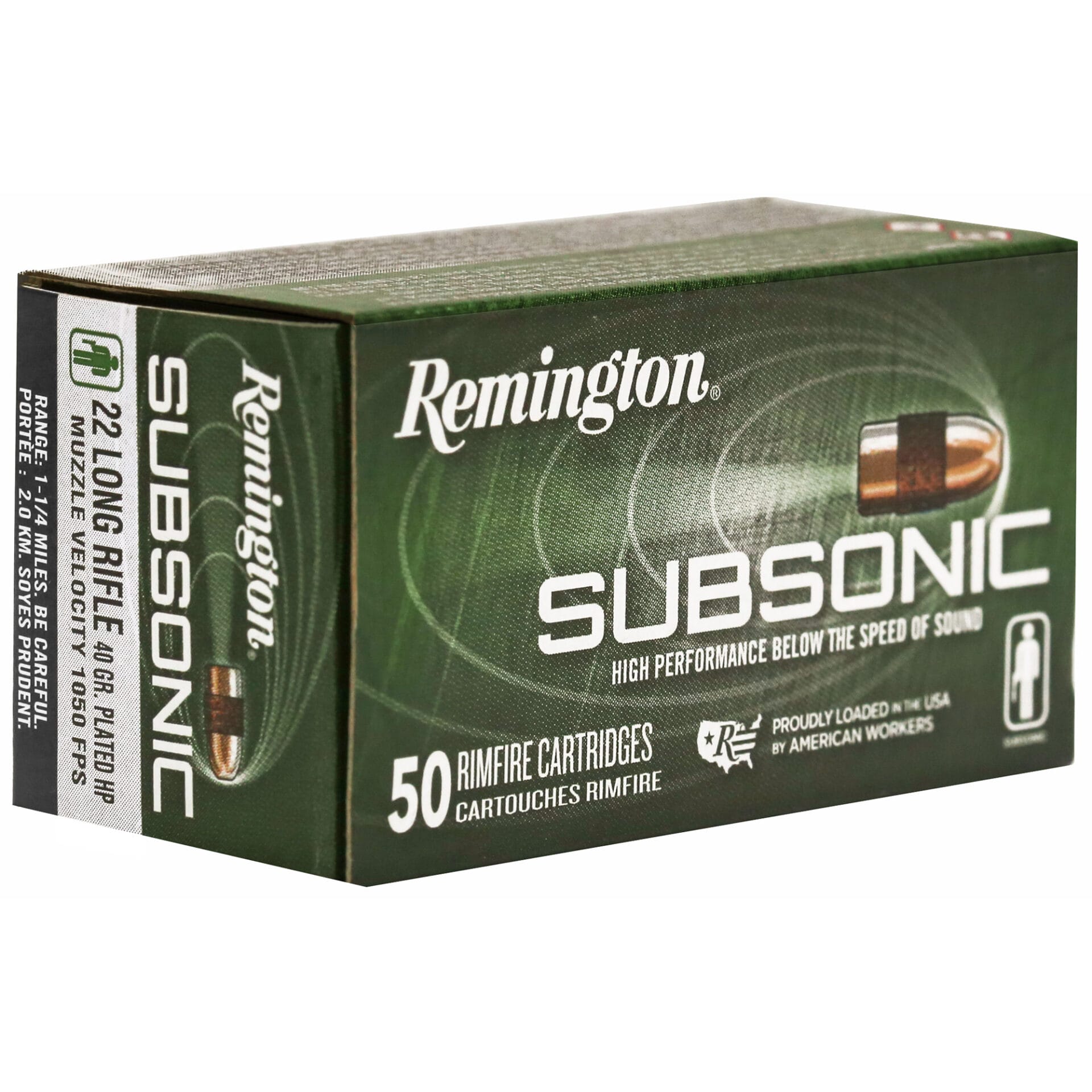 Subsonic delivers superior stealth and consistency below the sound barrier. Its tack-driving rimfire performance was developed through a joint effort of Remington and AAC team experts” manufactured with tight velocity control to eliminate supersonic cracks. Driving a copper-plated” hollow- point bullet optimized for reduced lead buildup in silencer ports and maximum effectiveness at lower velocity.